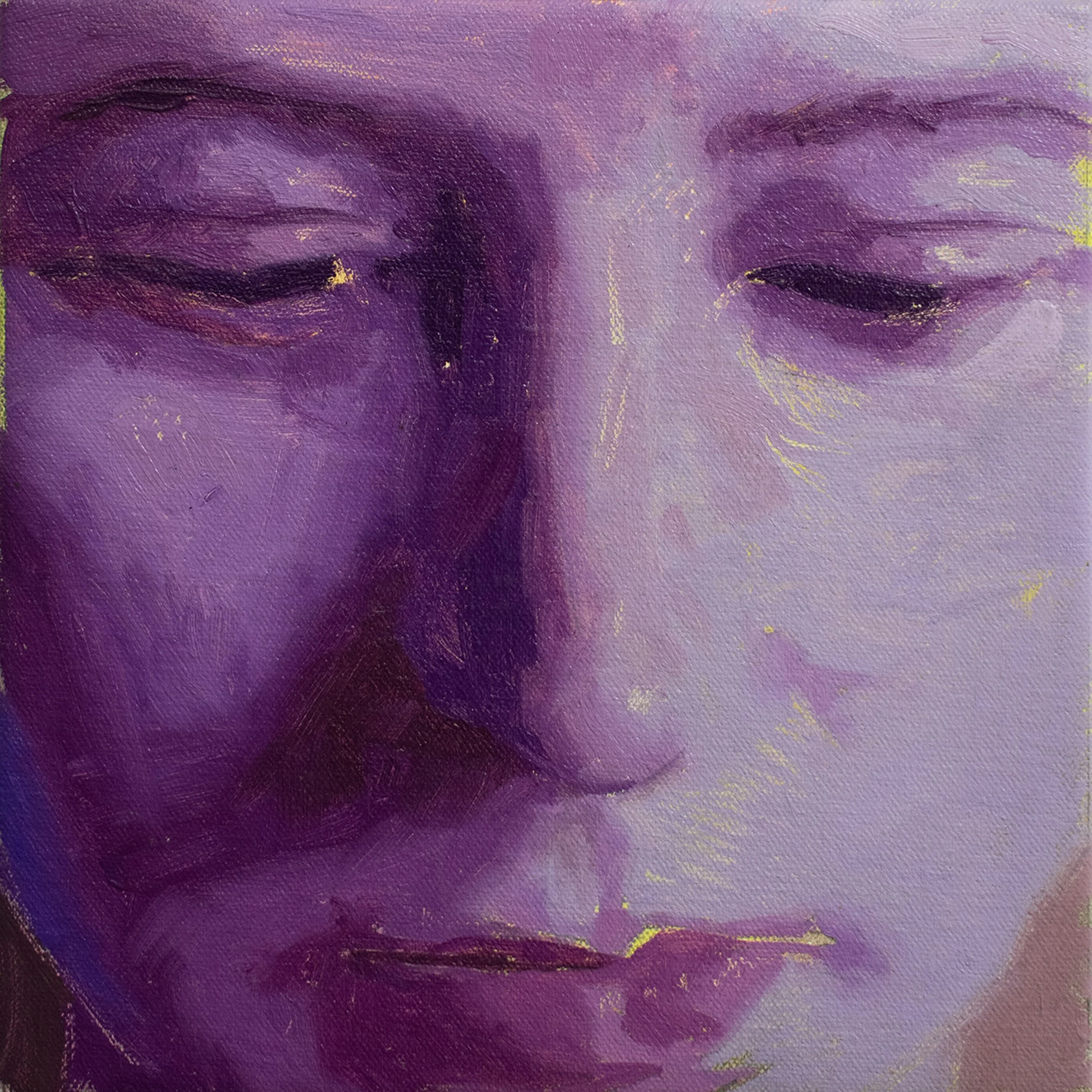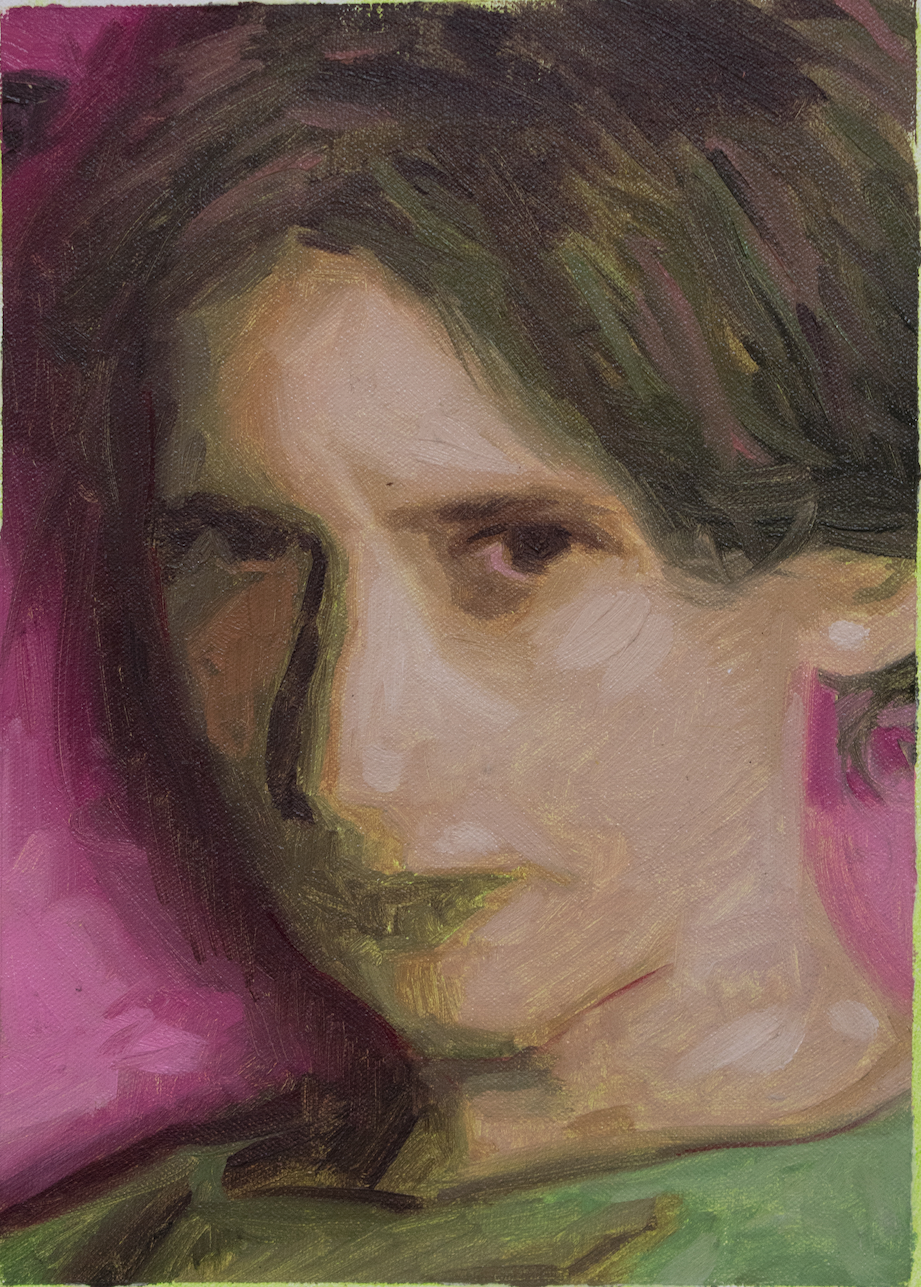 self portrait in purple, 2024, oil on unstretched canvas, 29 x 20cm
